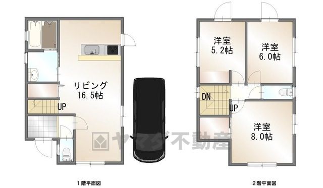 LDK16畳(1F)、洋5畳(2F)、洋8畳(1F)、洋6畳(2F) |